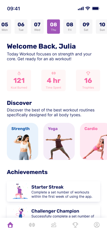 The exercise tracker’s first screen is the home screen that has the user’s daily calories burned, time spent exercising, and trophies earned. The user can discover new types of workouts while also viewing their achievements earned.