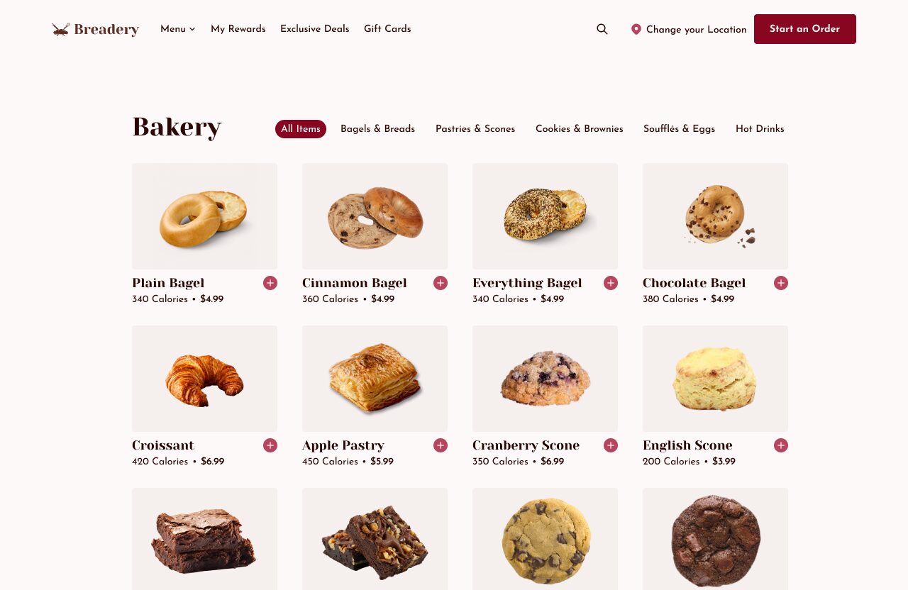 Daily UI’s forty-third challenge is a Food Menu Items UI. For this challenge, I created a bakery company called Breadery that sells a variety of baked goods from bagels to brownies. Breadery’s website allows users to start an order online and add items to a shopping cart to order online.
