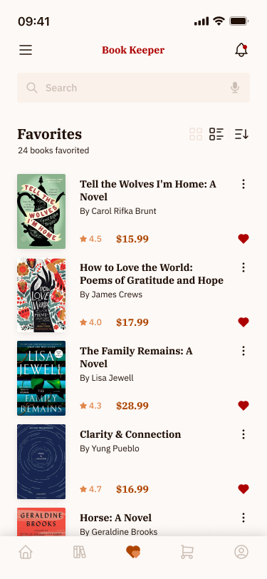 The Favorites UI features a list of the books users have favorited on the platform. The cards provide the user with the book’s overall reviews and pricing. Users can browse for more books through the search bar and change the order of the list with the icons to the right.