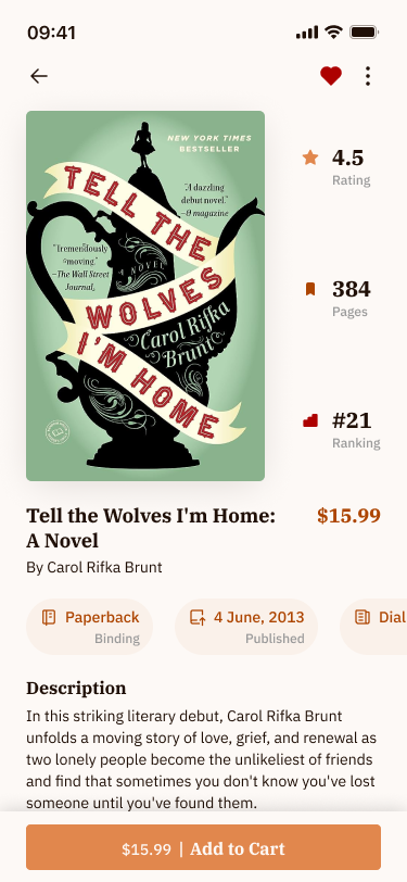 I reused the design’s style of an autumn theme with red and orange colors, as well as the IBM Plex font family. The design of the interface features the book’s cover with ratings, page numbers, and rankings to the right of the cover image. Users can view the physical book’s properties such as the binding, publishing date, and publishing company.