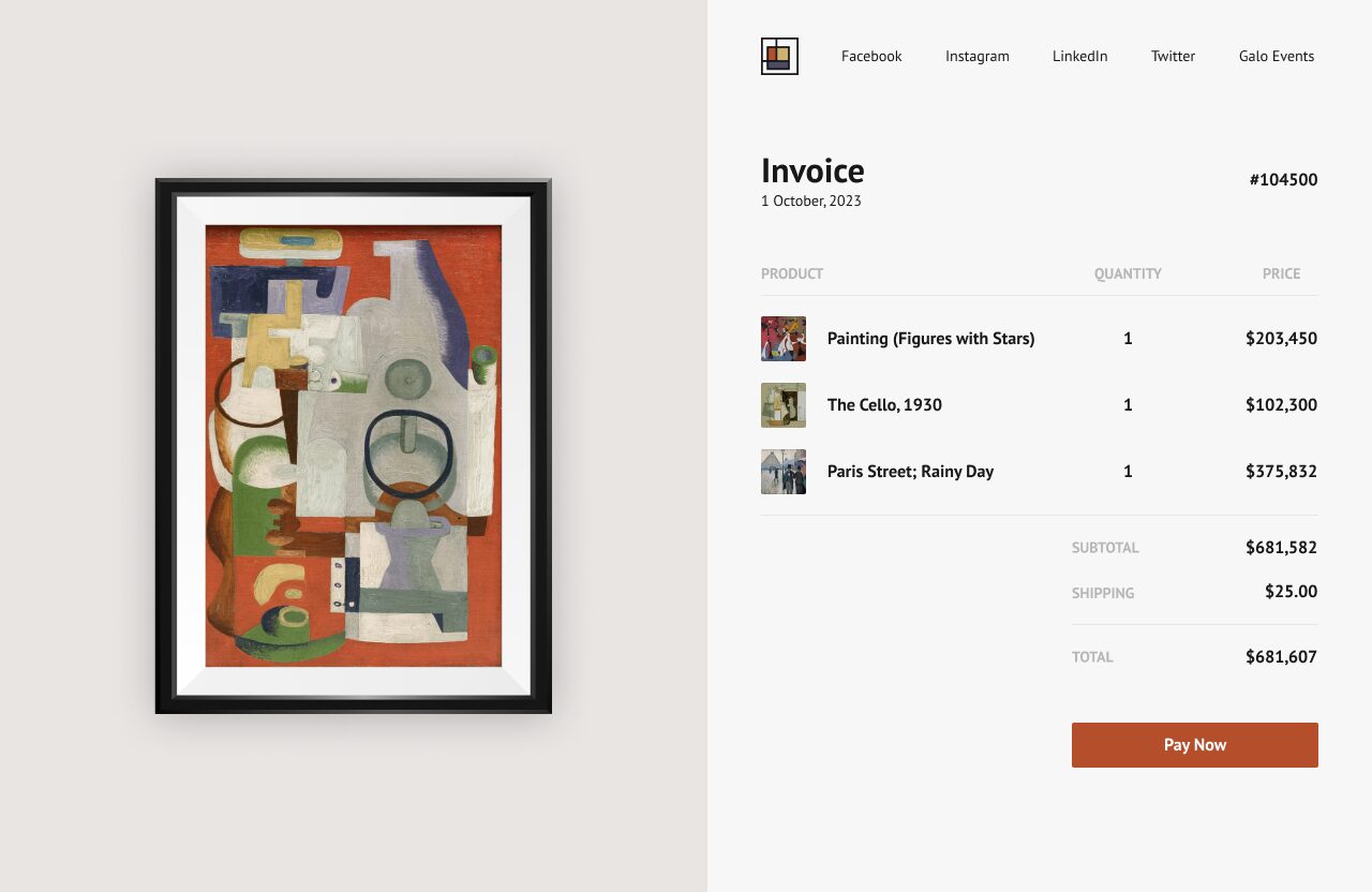 The invoice consists of a placeholder image from the gallery to the left of the form. The form includes the gallery’s logo and social media links. The invoice provides the user or client with the products purchased, quantity, and price. The user can pay for total online through the CTA button, Pay Now.