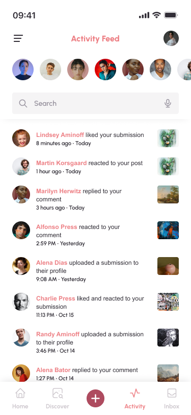 The Activity Feed feature’s a category of users who have reacted to the user’s content. The feed has the name of the user or artist, their reaction or submission, and the image of the art to the right of the screen.