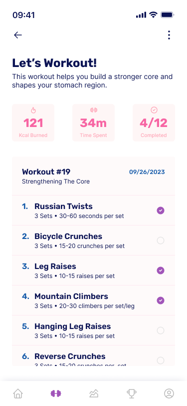 The second screen of the app is the workout tracker and has an exercise template for the user to follow. The app provides the user with a list of exercises to complete every day. When the user finishes the exercise, they will earn an achievement.