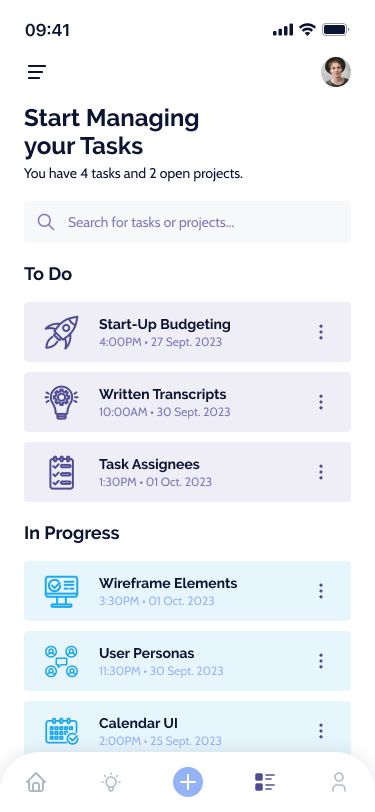 The second screen is the Task Overview screen which features all current tasks by the three categories: To Do, In Progress, and Completed. Each task has the due date and due time with individual icons and colors.
