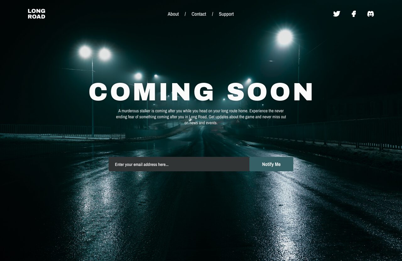 The forty-eighth challenge from Daily UI is a Coming Soon UI. For this challenge, I designed a Coming Soon UI for a horror game called Long Road. The game follows a player on their route home but something is following the player and they have to try to survive.