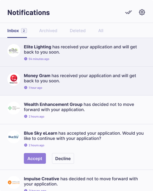 The Notifications UI features a menu for an Inbox, Archived, Deleted, and All. The notifications list includes the company the user applied to, the message or action, and the date the notification was received. Companies can also accept an application for the user to move forward.