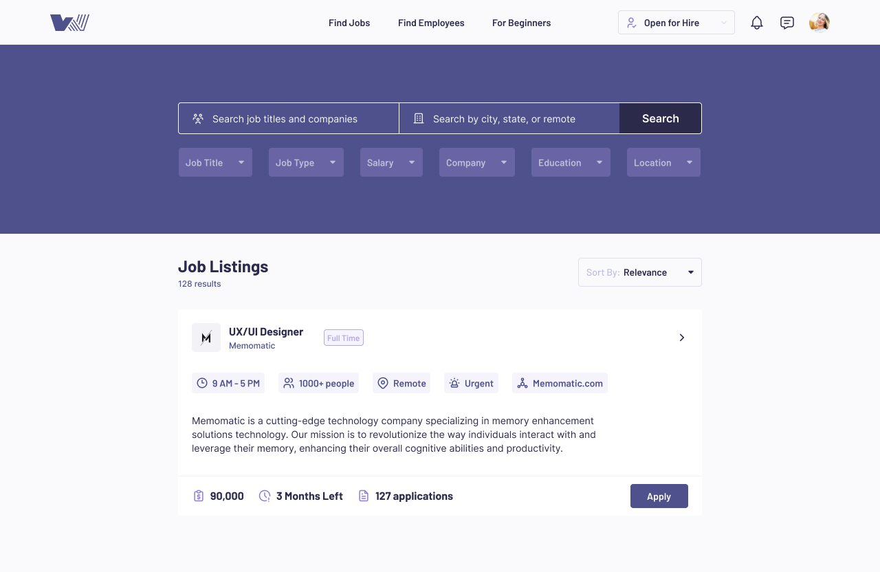 The Job Listing features a wide search bar where users can search for a job title or company and sort by city or remote. The job listing card has the job title, company name, description and information about the company’s hours, employees, and urgency hiring. In the section where users can click apply, the listing provides the salary, time left until the job will be filled, and the number of applications submitted.