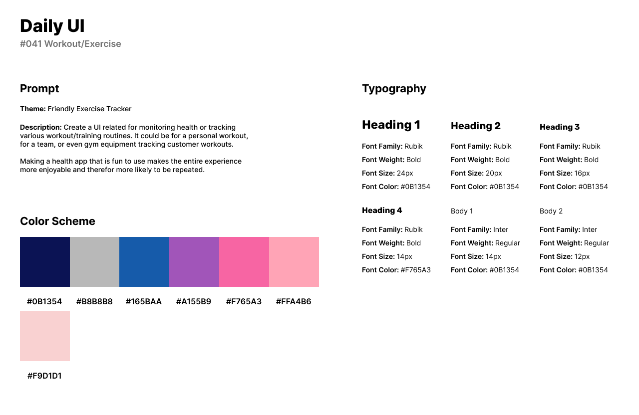 The forty-first design by Daily UI is a Workout/Exercise UI. For this challenge, I designed a friendly and bubbly themed exercise tracker where users can track daily exercises and receive exercise templates from the app.