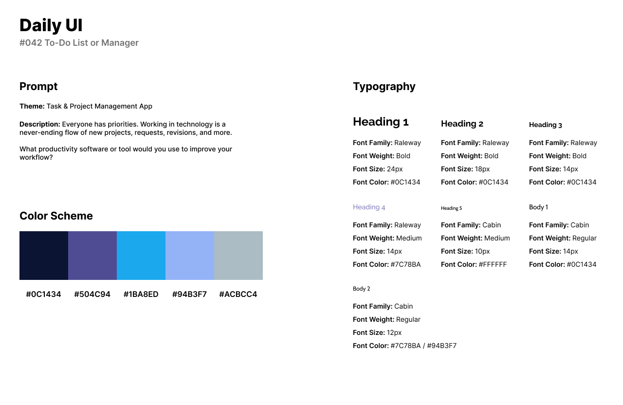 The style of the UI uses a purple and blue color scheme as the colors provide a calming combination when working with complex or stressful tasks or projects. I use Raleway as a friendly and stylized font for headlines and titles with Cabin being used for secondary titles and body text as a flatter Sans-Serif font.