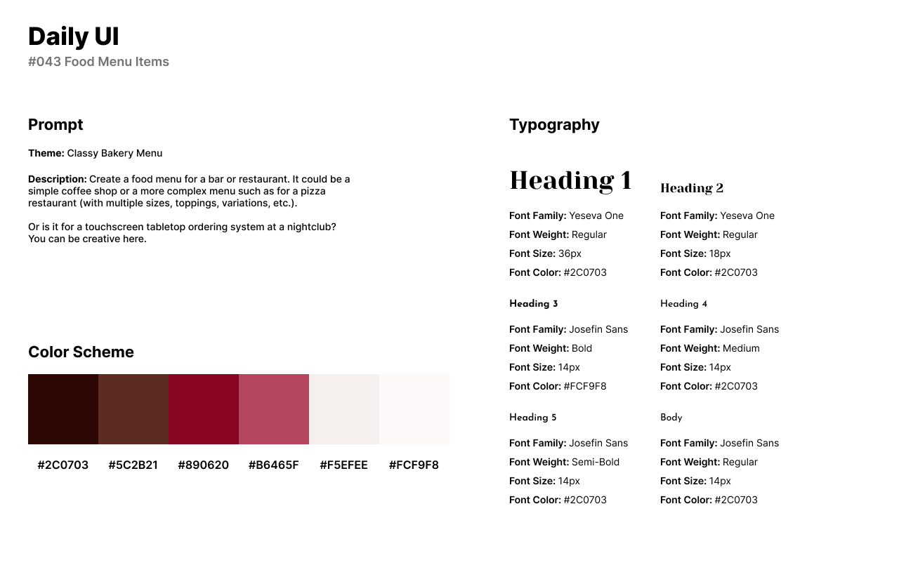 The UI’s style has a dark red color scheme with a dark pink for accents and brown for body text. To be in line with a classy and comforting theme for a bakery, I used the Serif font Yeseva One for headlines. I used Josefin Sans for secondary titles and body text as a circular and sociable Sans-Serif font.