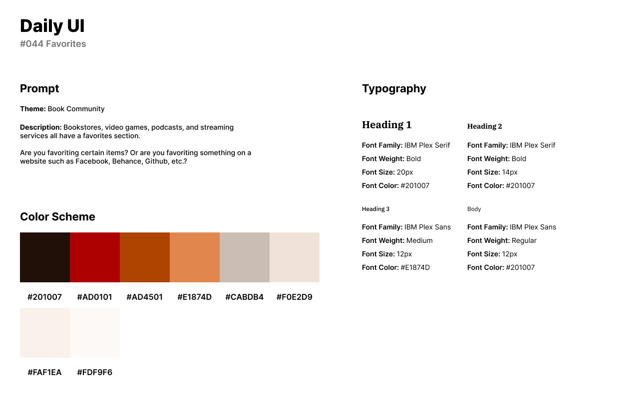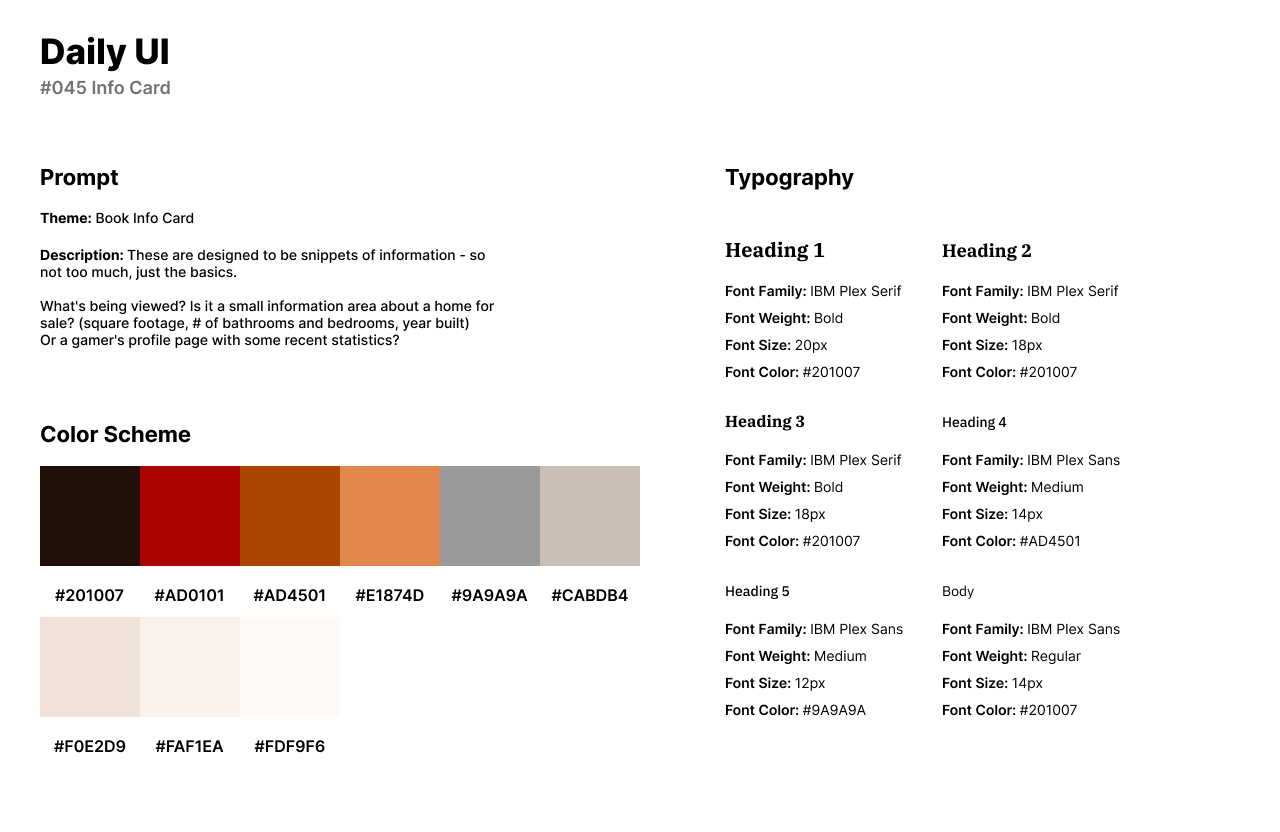 The style of the app has an autumn color palette of reds and oranges with a beige background. I used IBM Plex Serif for headlines as a classy and comforting font style. For body text and secondary titles, I used IBM Plex Sans as the IBM font series pair well with one another.