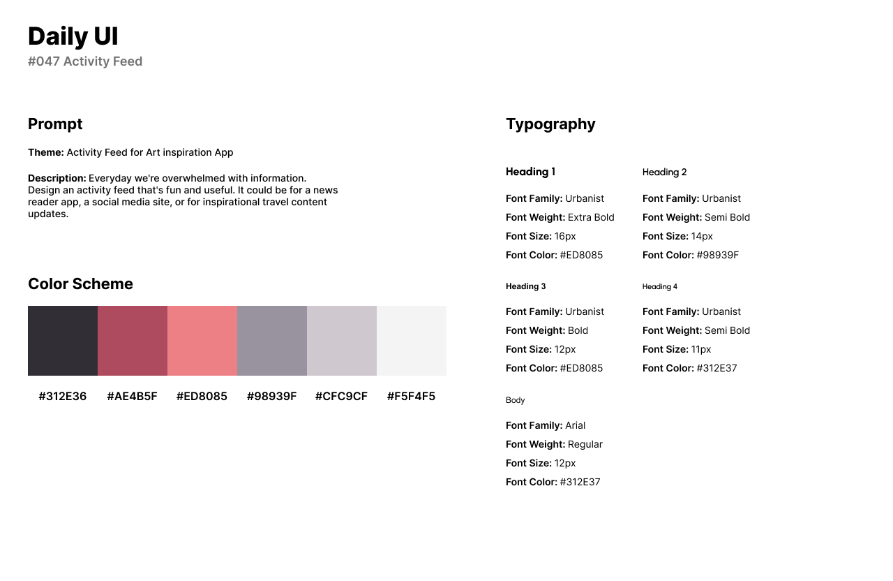 The forty-seventh challenge by Daily UI is an Activity Feed. For this design, I designed an activity feed screen for an art inspiration app. The app features an online community of artists who upload their art to the platform and they can react to each other’s’ work.
