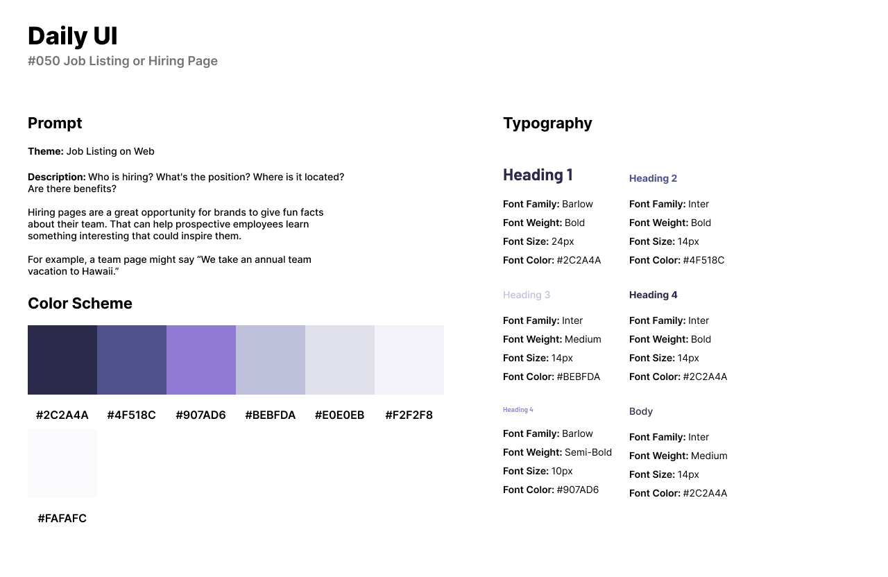 The fiftieth design challenge by Daily UI is a Job Listing or Hiring Page. For this challenge, I reused the style guide from the previous challenge as it is for a Job Application website. The job listing website allows users to search for any job and apply if they meet the requirements.