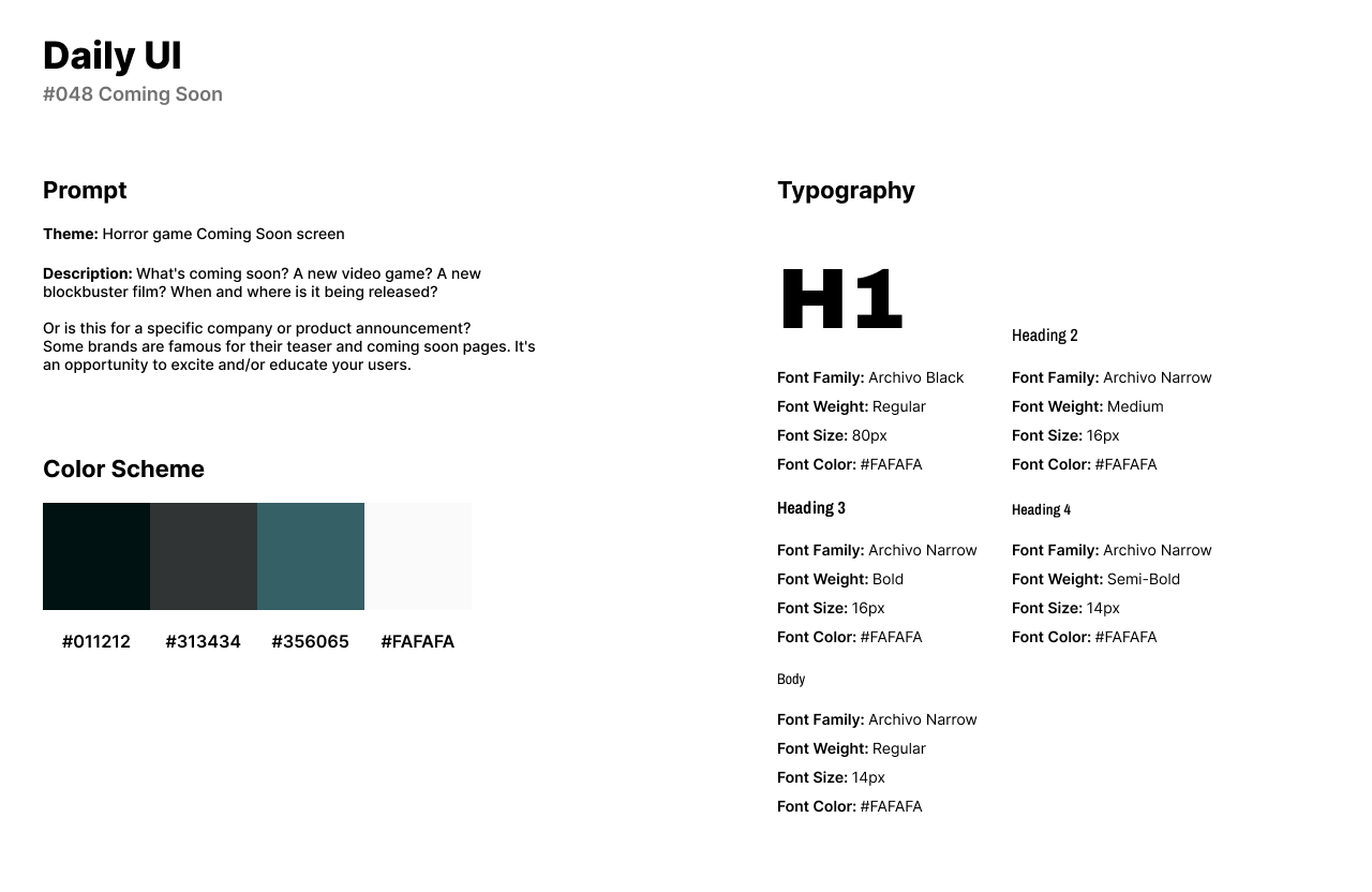 The style of the design uses a dark and stormy image as the background with a color scheme of black and teal pulled from the image. For fonts, I used the Archivo font family as Archivo has a variety of font weights that fit in well with the horror theme of the game.