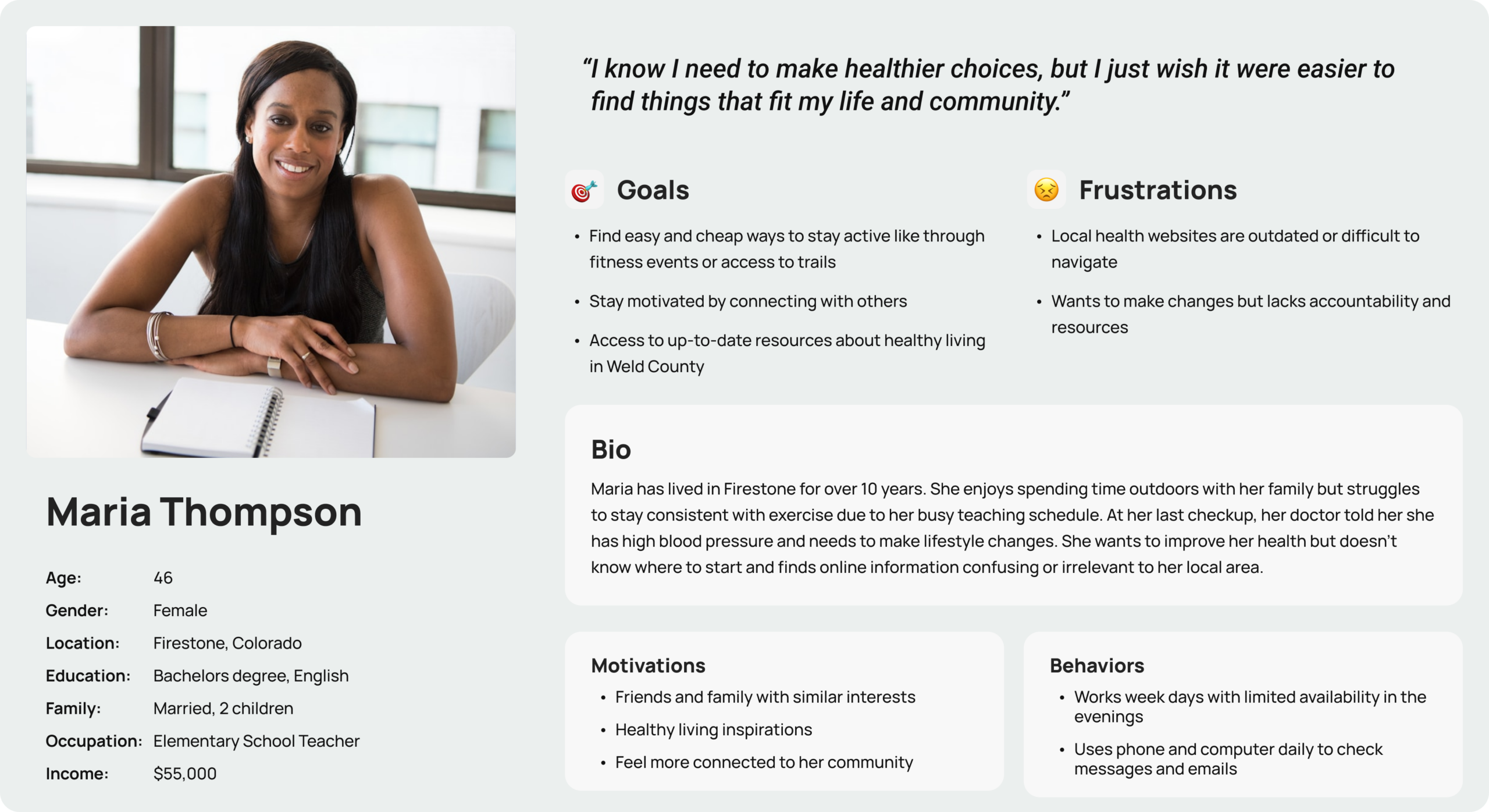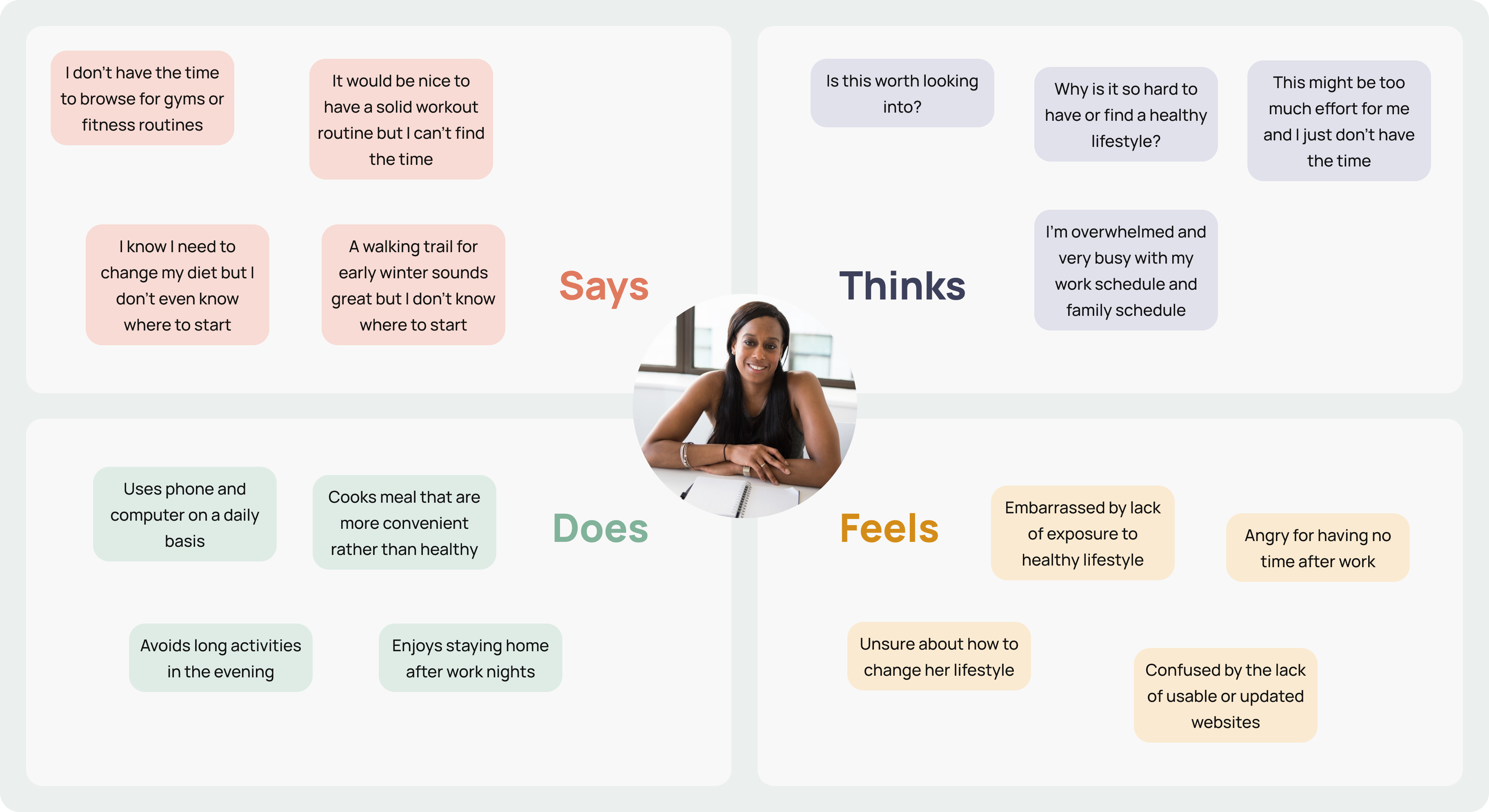 Project 3 began by defining the user who wishes to make healthier lifestyle choices but does not understand or believe she has the time to do so