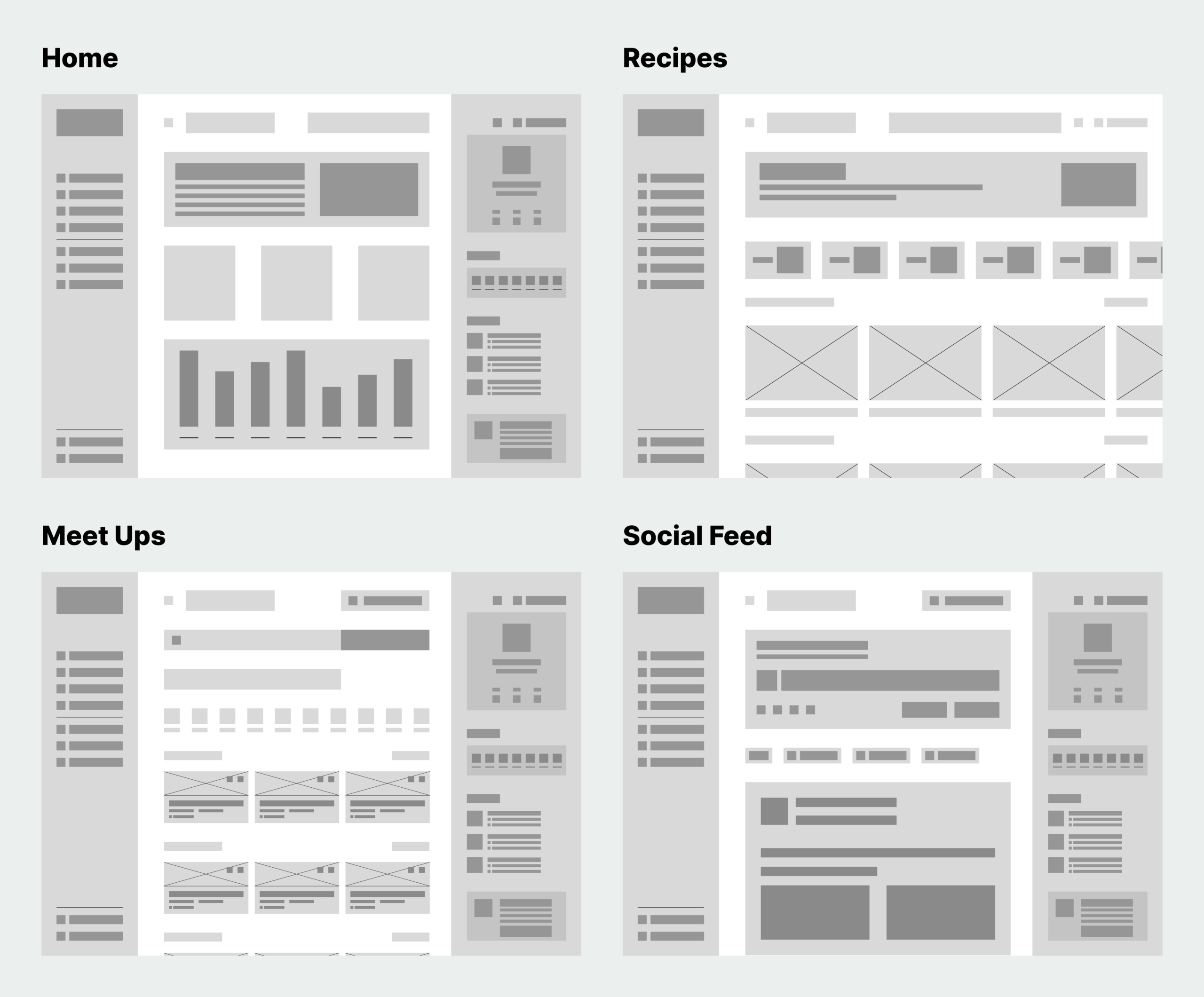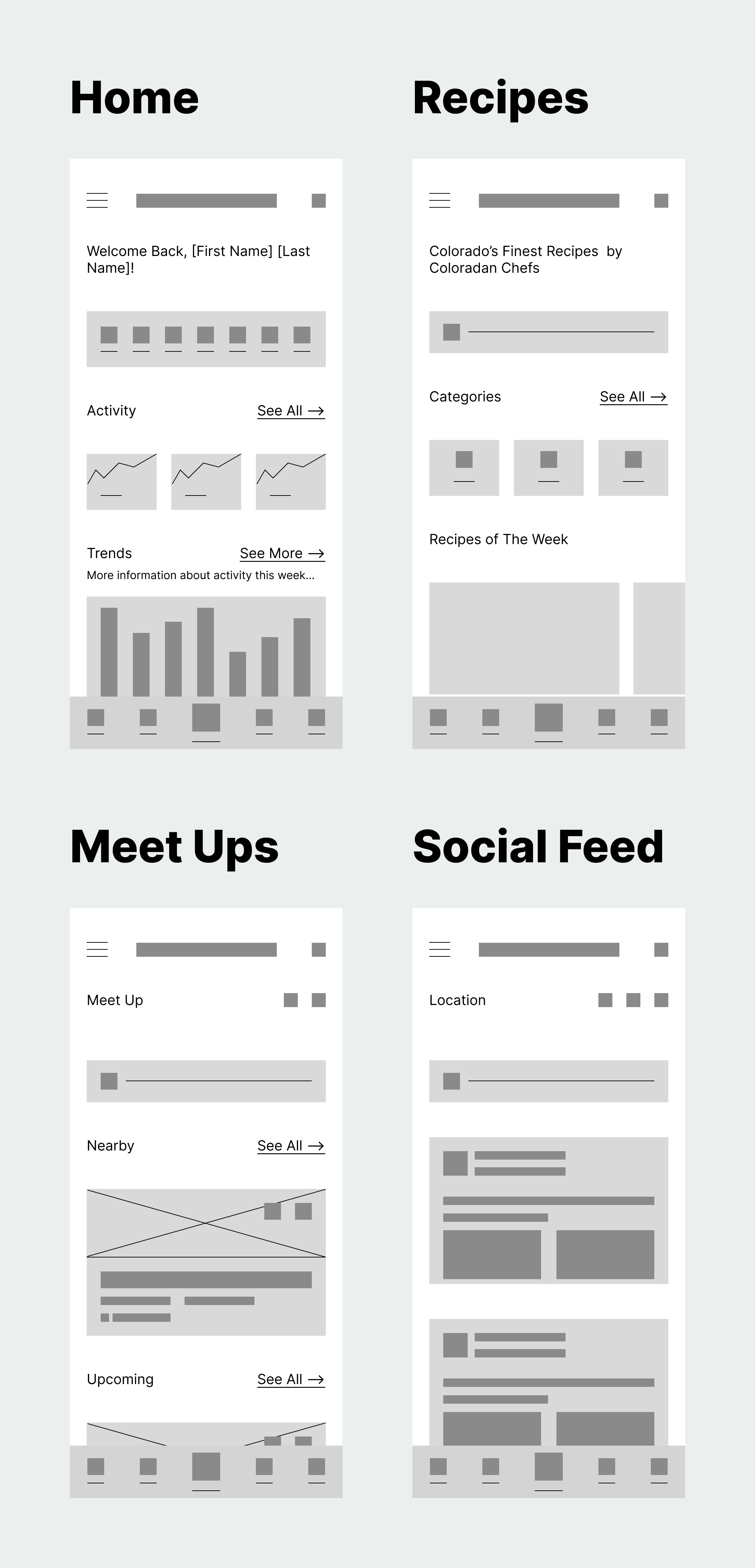Each sketch includes screens for Home, Recipes, Meet Ups, and the Social Feed