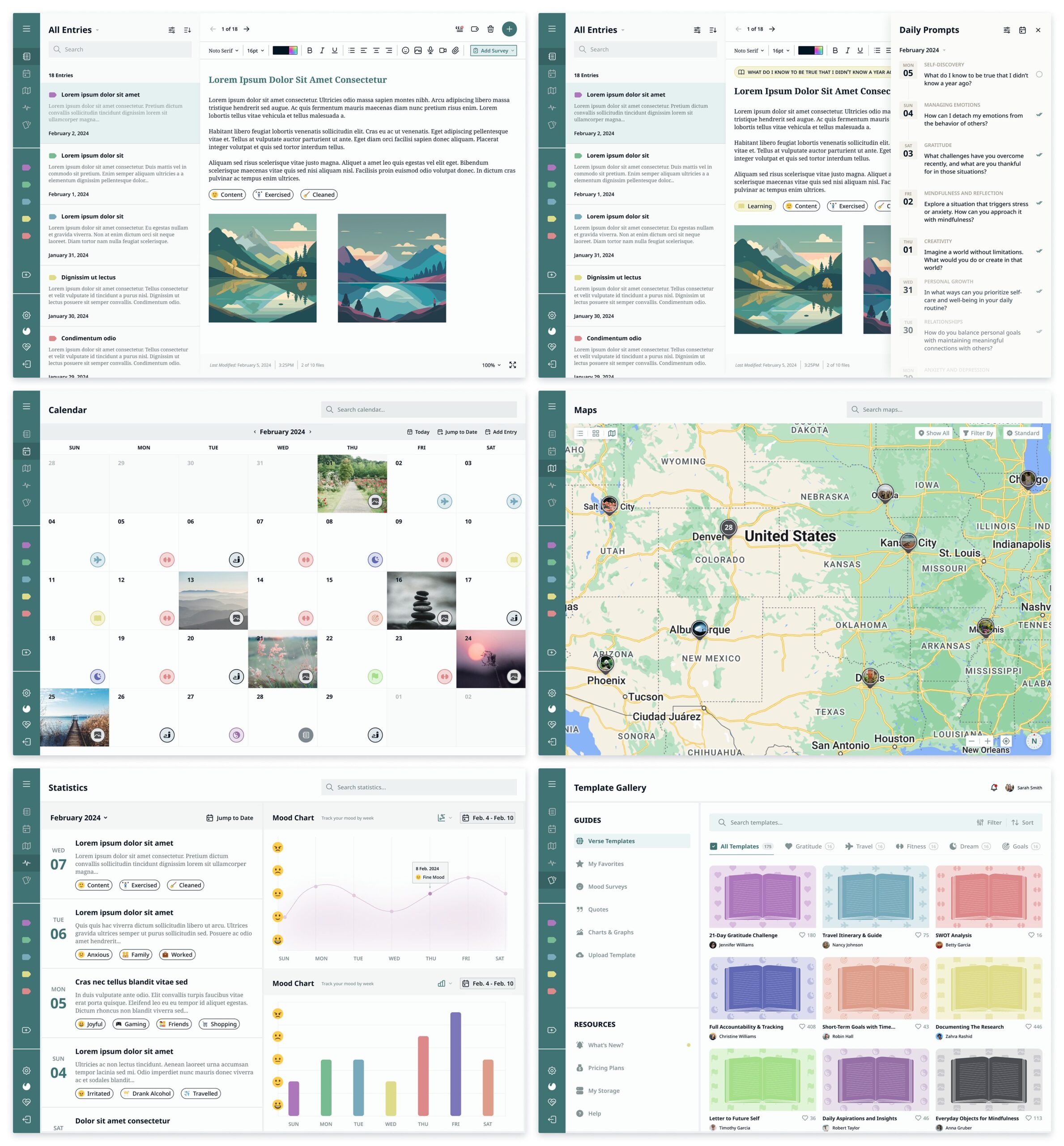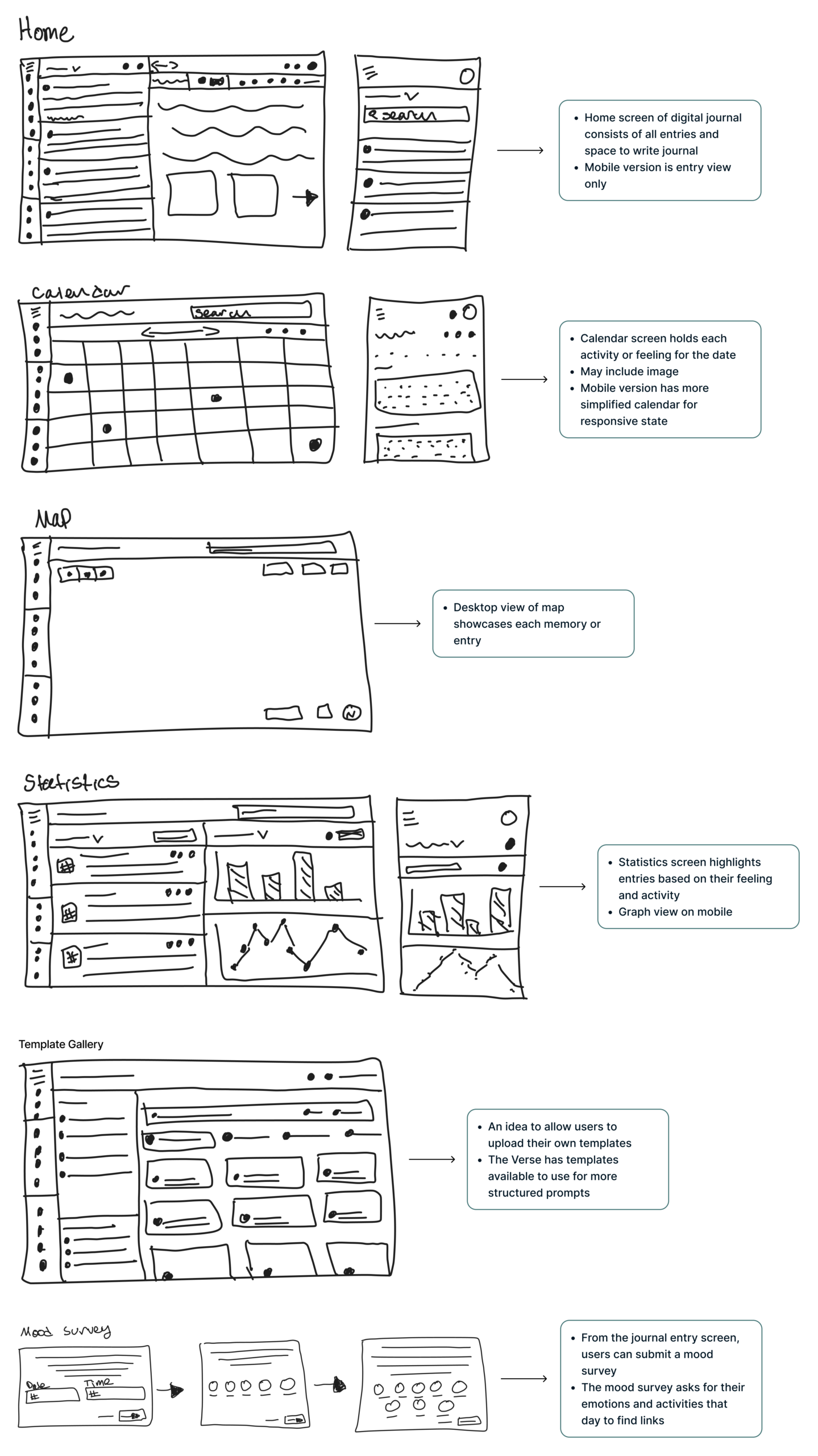 The sketches below feature desktop screens for Home, Calendar, Map, Statistics, Template Gallery, and a Mood Survey.