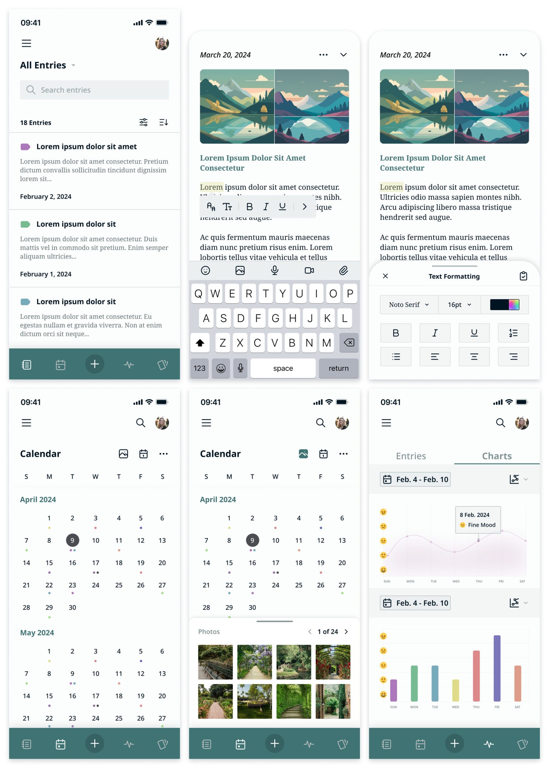 The mobile mockup features screens for Home, Journal Entries, Editing Format, Calendar, and Statistics.