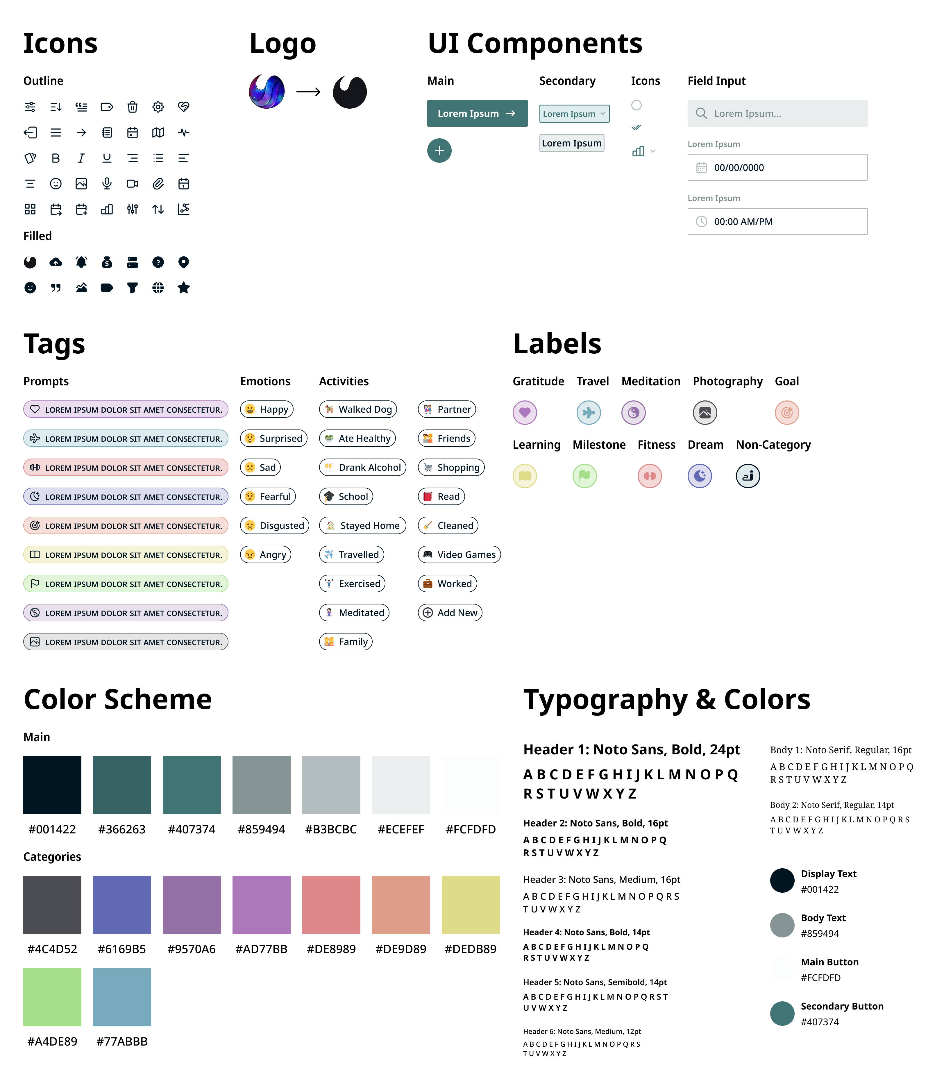 The Sticker Sheet holds the brand style guide and UI elements of the web and mobile platform. A muted nature theme was chosen for a calming and "down to earth" aesthetic while the fonts Noto Sans and Noto Serif were chosen for their modern appearance.